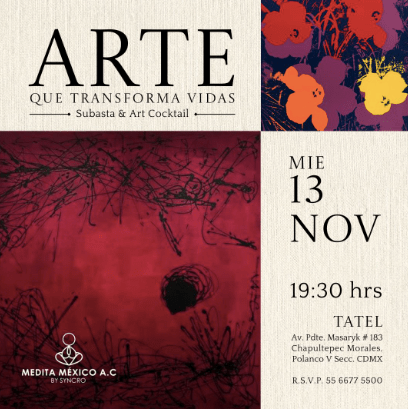 La Fundación Medita México se complace en anunciar su próximo evento de recaudación de fondos, una exclusiva subasta de arte titulada «Arte que Transforma Vidas», que se llevará a cabo el miércoles 13 de noviembre a las 19:30 horas en el prestigioso restaurante de cocina española TATEL, ubicado en el corazón de Polanco.