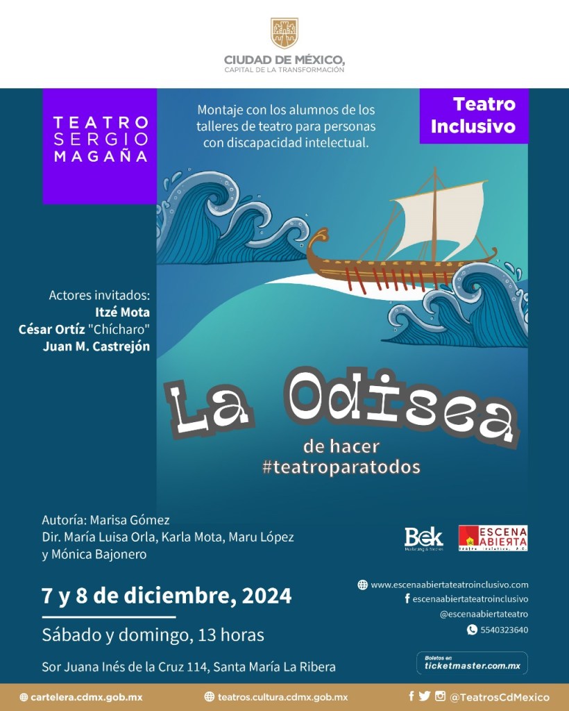La Dirección del Sistema de Teatros de la Secretaría de Cultura de la Ciudad de México, a través del Teatro Sergio Magaña, recibe con beneplácito la puesta en escena La Odisea… de hacer teatro para todos, una propuesta artística realizada por la asociación civil Escena Abierta Teatro Inclusivo con actores y actrices con Síndrome de Down (SD) y Trastorno de Espectro Autista (TEA).