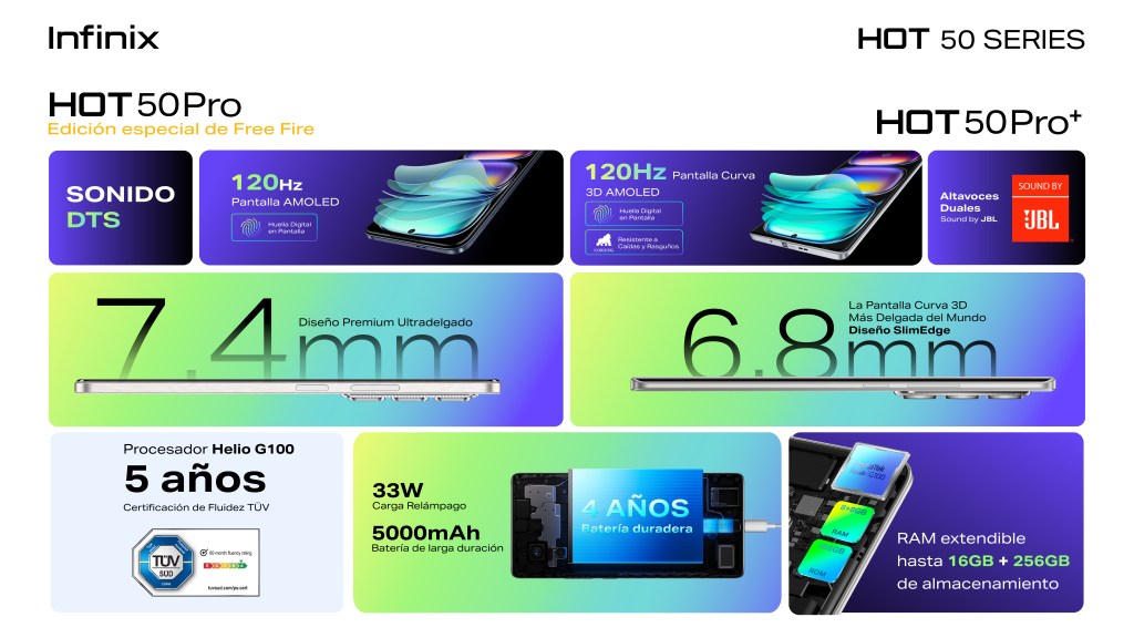 La serie HOT 50 de Infinix ofrece innovación, estilo y un gran desempeño con sus más recientes modelos. Estos dispositivos destacan no solo por su estilizado diseño, sino también por sus prestaciones que se adaptan tanto a los amantes del gaming como a quienes buscan rendimiento superior en su día a día. El HOT 50 Pro+ es el smartphone más delgado del mundo con pantalla curva, mientras que el HOT 50 Pro, teléfono oficial de Free Fire, está diseñado para llevar la experiencia de juego al siguiente nivel, hecho para verdaderos gamers.