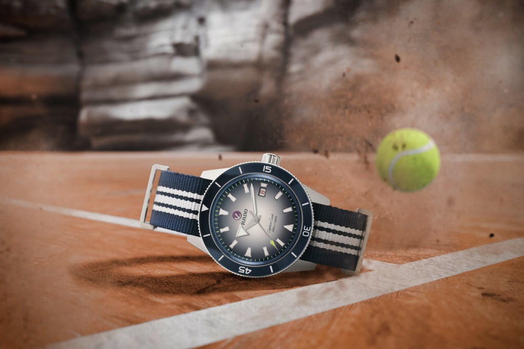 Rado ofrece una versión deportiva del Captain Cook Automático, inspirado en el mundo del tenis. Este reloj de diseño clásico cuenta con una esfera degradada en tonos azul y blanco, perfecta para resaltar la cancha. Así como, la punta del segundero central está recubierta de Super-LumiNova de color amarillo oscuro, a fin de conseguir una legibilidad excelente en todo tipo de condiciones de iluminación y haciendo referencia a el color de una pelota de tenis.