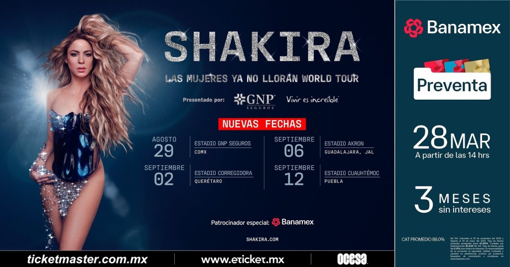 Después de romper el récord histórico por ser la primera artista en la historia de México en presentarse con siete shows consecutivos en el Estadio GNP Seguros con más de 600 mil boletos vendidos, y tras arrasar con rotundo éxito en Monterrey y Guadalajara, la superestrella global Shakira anuncia cuatro fechas más en nuestro país de su histórica gira Las Mujeres Ya No Lloran World Tour, producida por Live Nation. En respuesta a la abrumadora demanda de los fans, la segunda vuelta incluirá: Ciudad de México, Querétaro, Guadalajara y Puebla.