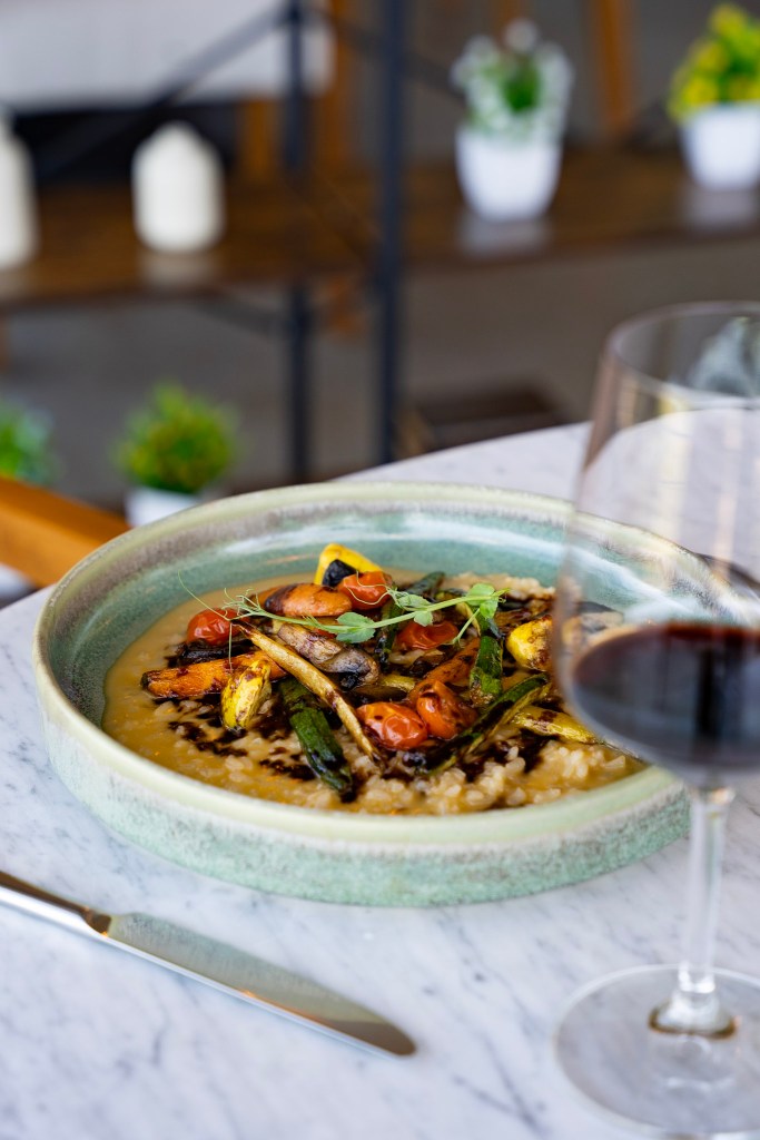 En el quinto tiempo, el chef apuesta por una cocina más introspectiva con un risotto vegetariano de verduras de temporada y un jus de vegetales tatemados. Aquí, el Primitivo “Nido de Abeja”, con 12 meses en barrica francesa, aporta redondez, notas de frutos secos y una textura envolvente que abraza la profundidad vegetal del platillo.