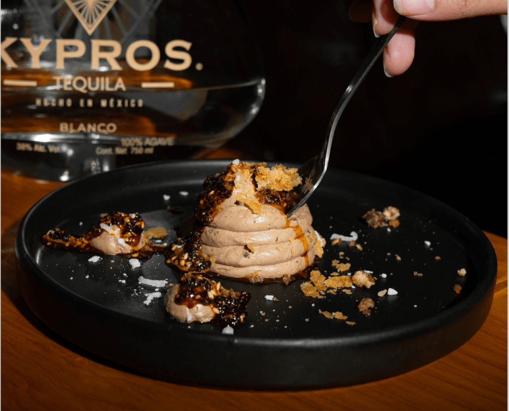 El primer tiempo, Susurro del Cacao, una mousse de chocolate al 70%, suave como una caricia, bañada en una salsa macha dulce que rompe expectativas con su toque picante y profundo. Es intensidad y ternura ala vez. Acompañado de tequila Kypros, el perfil elegante, ligeramente especiado y cítrico del destilado artesanal potencia los sabores. Es el bocado que dice: gracias por estar.