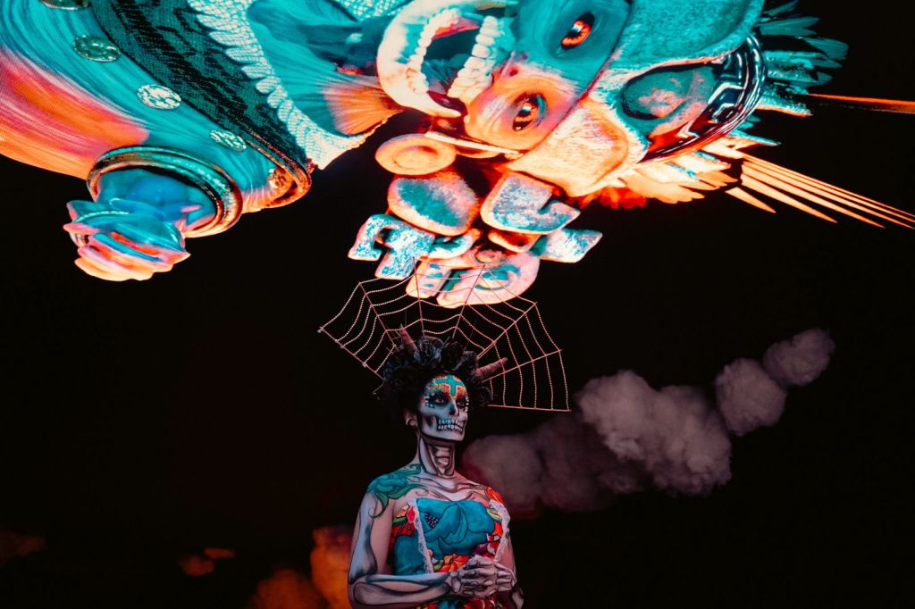 Esta experiencia (Un Viaje al Mictlán) fusiona el arte tradicional con tecnología inmersiva de vanguardia, combinando elementos como un tapete de aserrín monumental y esculturas artesanales.
