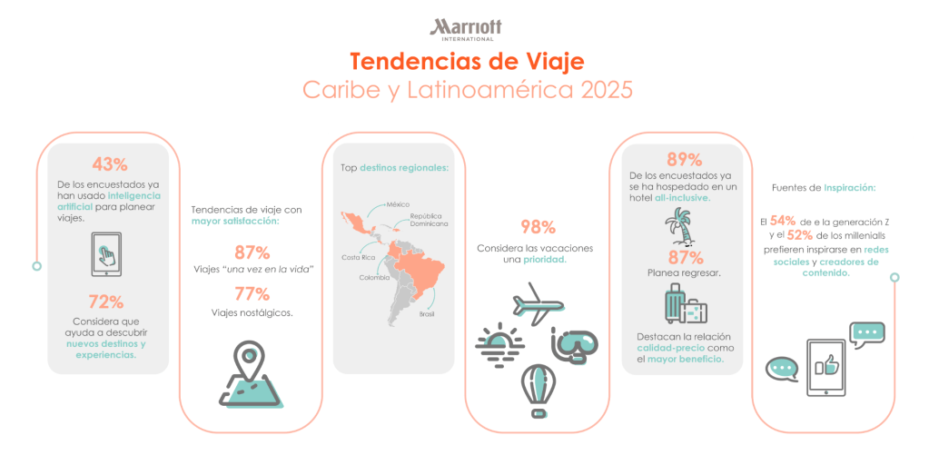 Por quinto año consecutivo, Marriott International publicó su encuesta anual sobre tendencias de viaje, «El viajero latinoamericano: prioridades, pasiones, y el futuro de las vacaciones», el cual ofrece información clave sobre el panorama cambiante de los viajes de ocio en la región. El estudio, para el que se consultó a 1,250 adultos en siete destinos clave de la región Caribe y Latinoamérica (CALA), demuestra que existe una base de viajeros dinámica y muy entusiasta, la cual considera a las vacaciones no solo como una actividad de descanso o diversión, sino como una prioridad fundamental.